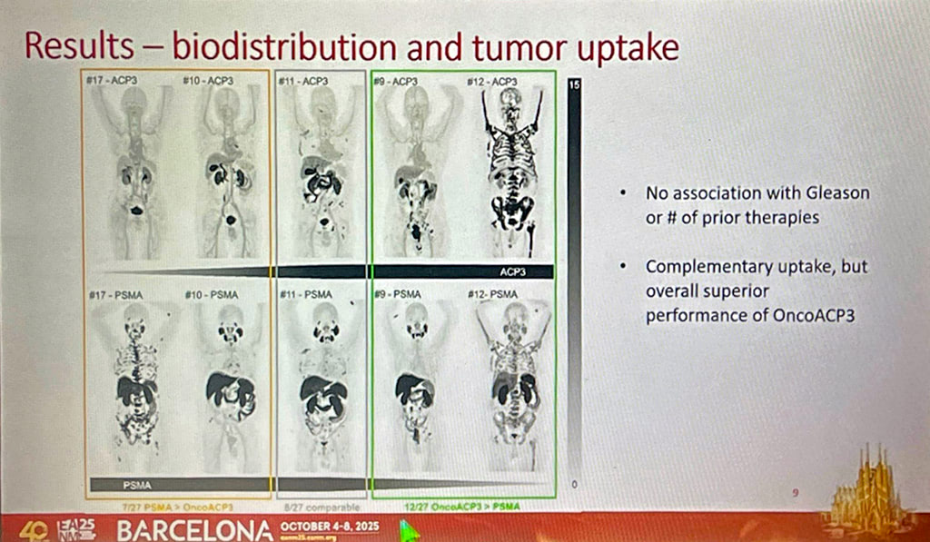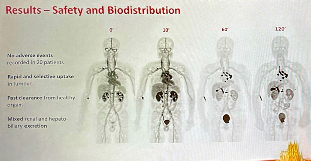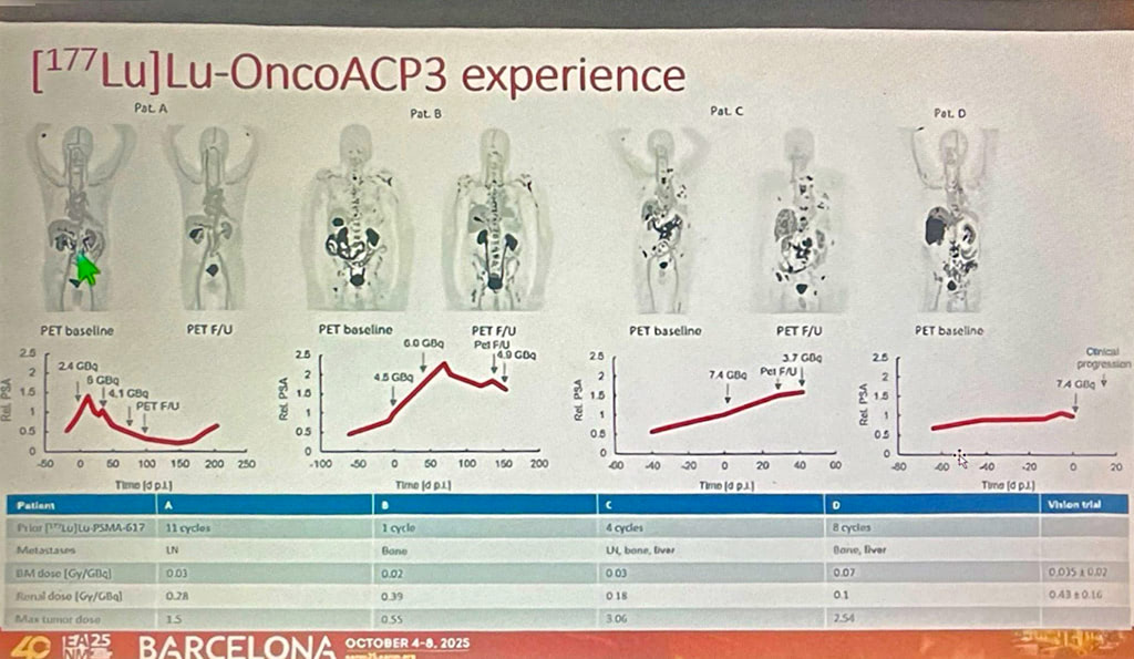 İtalyan ve Alman ekipleri tarafından EANM’de sunulan Ga-68 ve Lu-177 bağlı ACP3-DOTA görüntüleme bulguları, bu molekülün ilgi çekici özelliklerini ortaya çıkarmıştır. ACP3’ün tükürük bezleri ve böbrekte ekspresyonu olmaması, atılımının erken dönemde üriner sistem, geç dönemde ise safra yolu ile olması bu molekülün klasik PSMA tedavisindeki doz sınırlayıcı organları daha az etkilediğini ve özellikle alfa tedavilerde “problem çözücü” bir tedavi seçeneği olarak karşımıza çıkacağını düşündürmüştür. Cazzamalli ve arkadaşlarının yayınladığı in vivo ortamdaki Lu-177 ACP3-DOTA verileri de 2. saatte > 148 tümör/kan havuzu oranı ve t1/2 72 saat tümör dokusunda kalış süresi ile (residence time) bu konudaki kaygıları azaltmaktadır.
